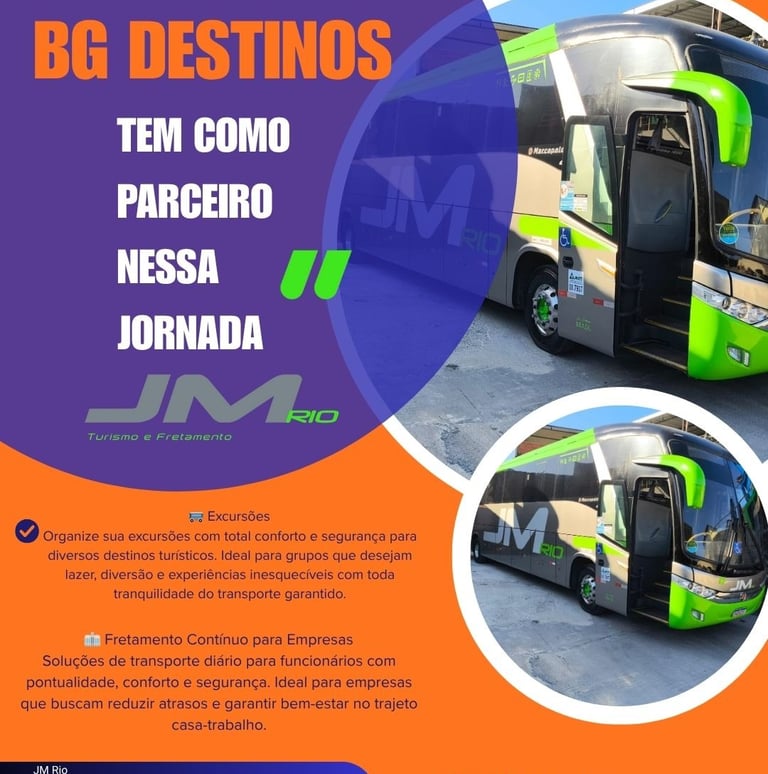 Oferecemos serviço de fretamento de ônibus para excursões, com conforto, segurança e pontualidade. Nossa frota é moderna, revisada regularmente e conduzida por motoristas experientes. Atendemos viagens turísticas, escolares, religiosas, corporativas e eventos em geral, sempre priorizando a satisfação dos passageiros.